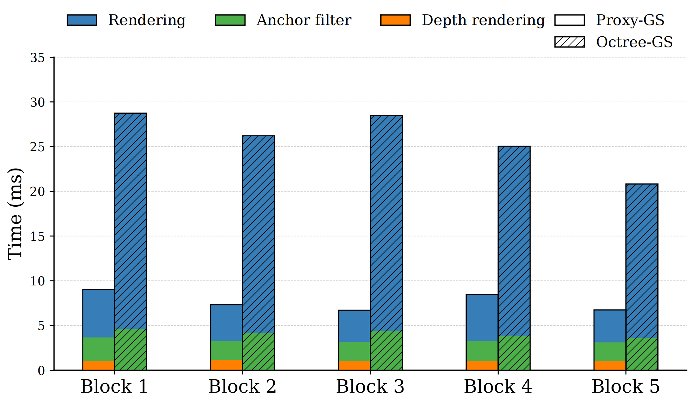 Compared to existing baselines, Proxy-GS enables virtually cost-free depth-based occlusion culling, which in turn significantly reduces the overall rendering time in large scenes with heavy occlusions, while introducing no additional burden in smaller or less-occluded environments.